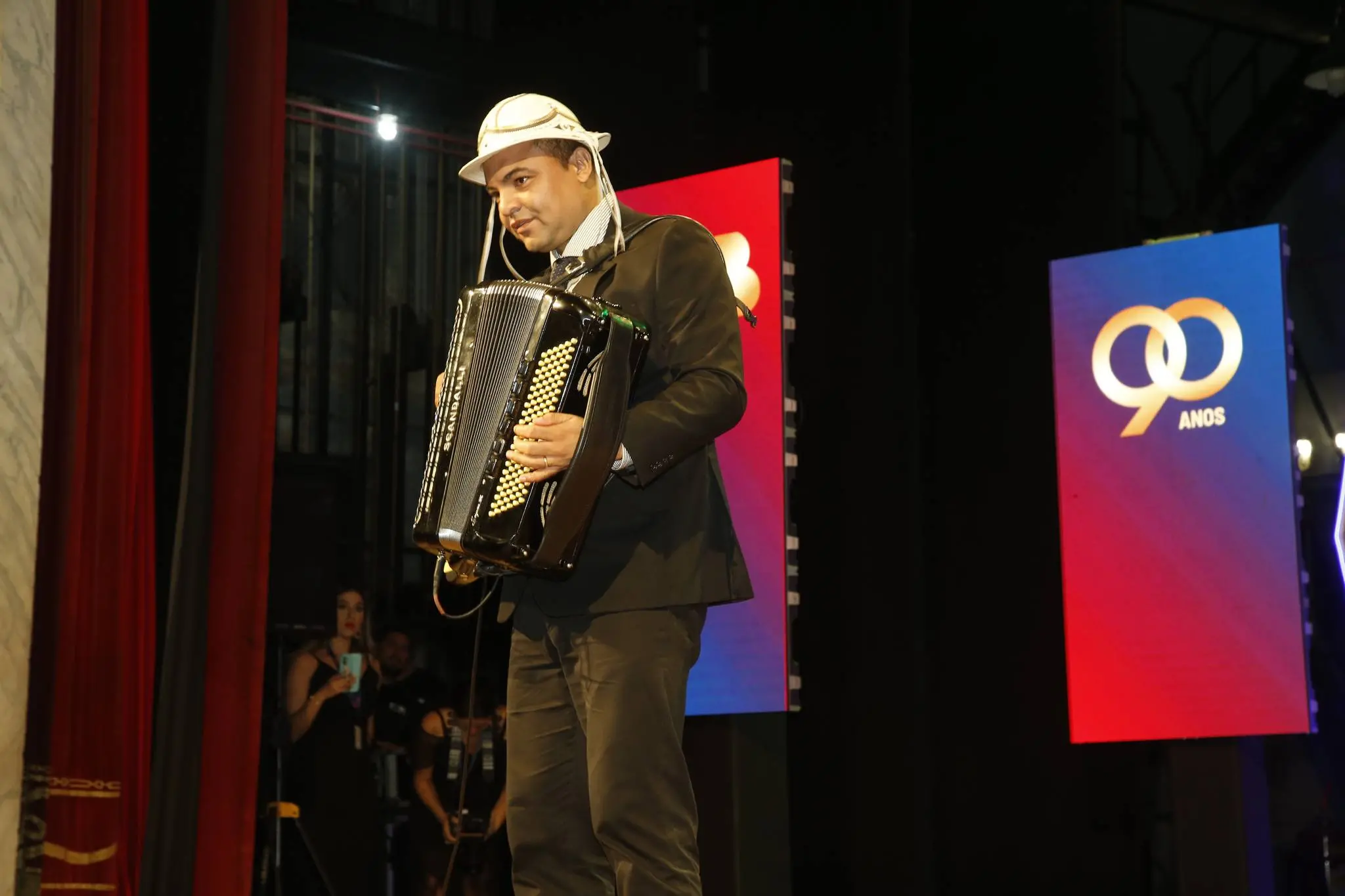Chambinho do Acordeon tocou o hino nacional antes da exibição do filme que narra a história dos 90 anos da entidade.