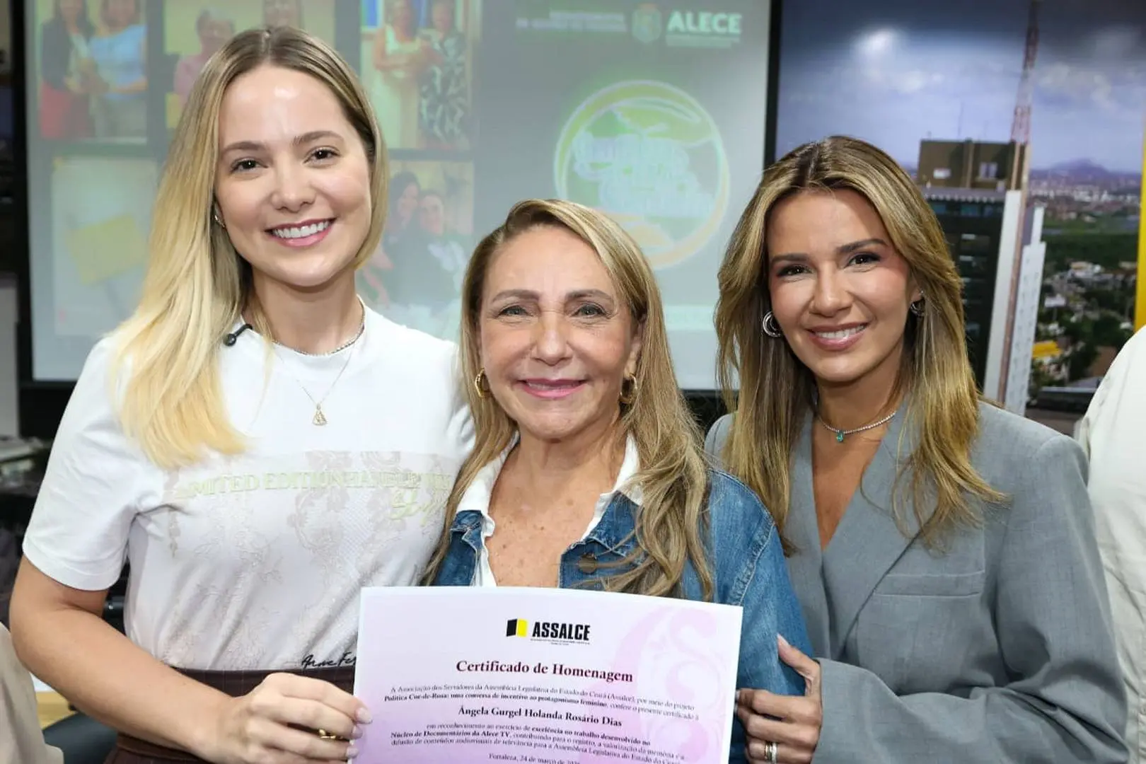 Ângela Gurgel recebeu homenagem sob holofotes. À frente do Núcleo de Documentários da Sistema Alece de Comunicação, vem consolidando uma trajetória onde conteúdo é poder e narrativa é legado.
