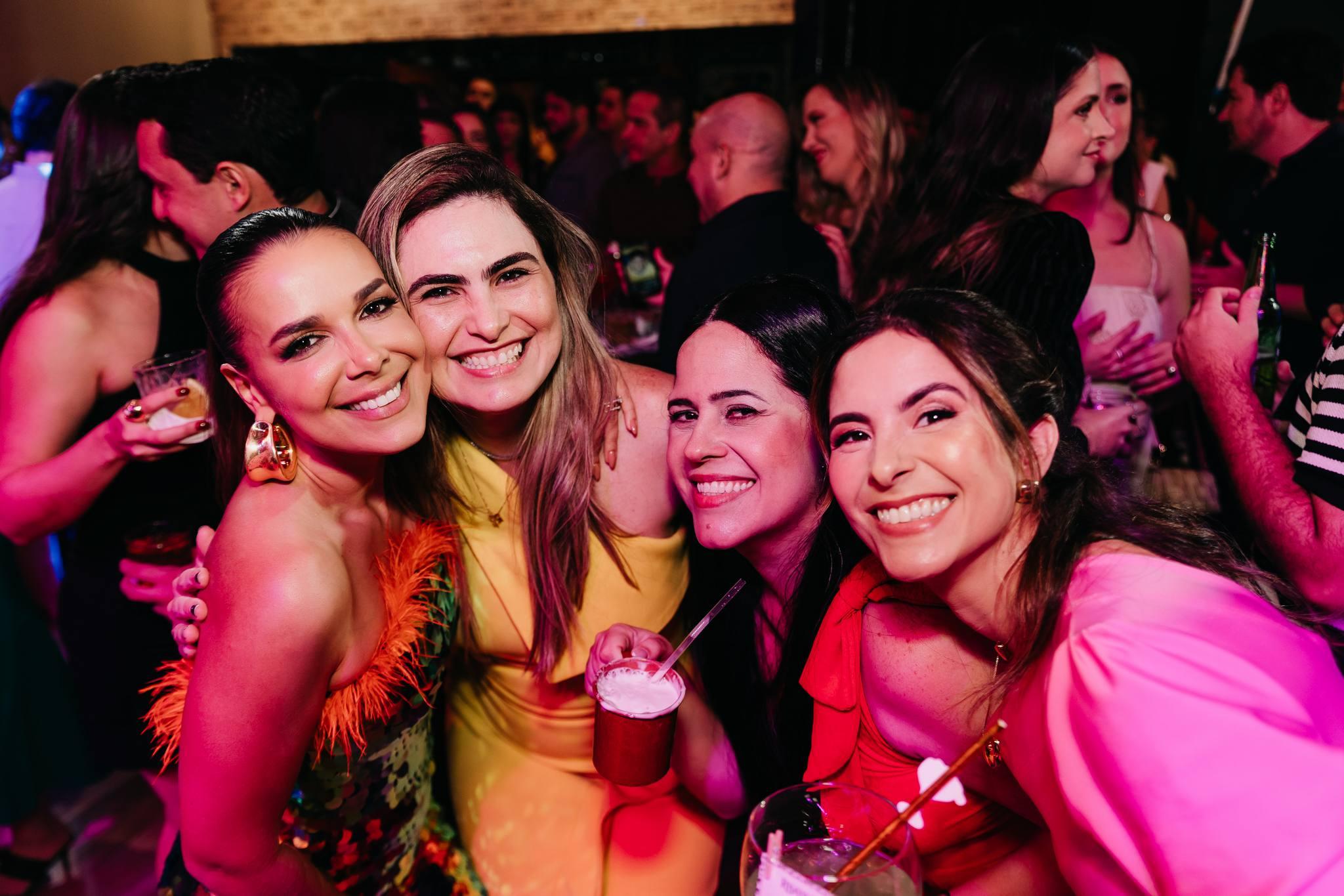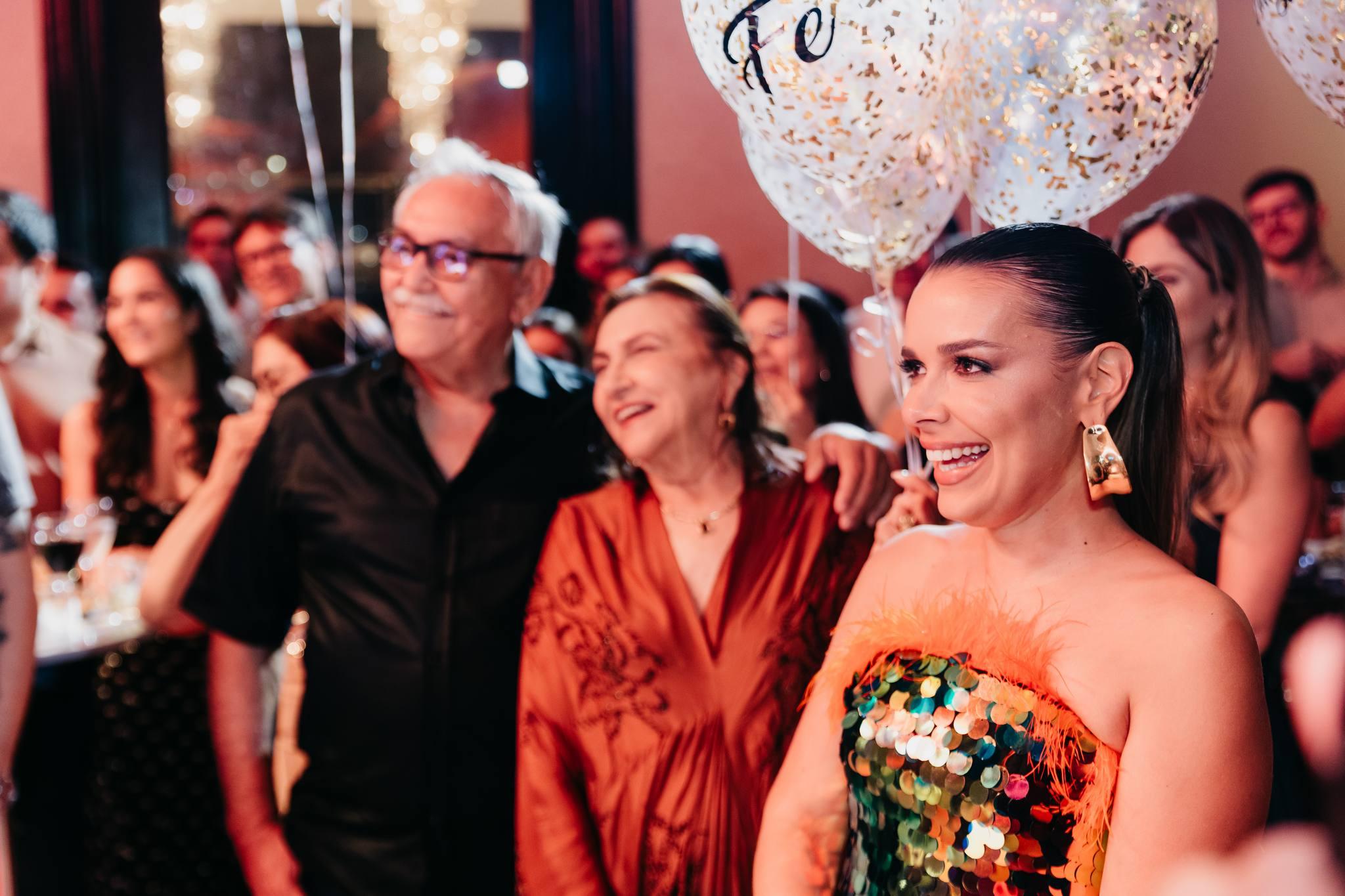 Vestida de Tici Sampaio e de si mesma, a aniversariante entrou num tubinho de paetês com plumas laranjas. Cabelos presos e beleza para estourar. Brilhava! Divou. Ponto parágrafo.