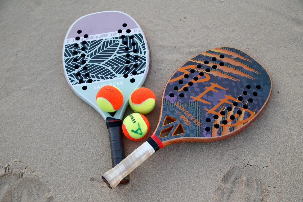 O principal instrumento de trabalho do BT é a raquete. O material pode ser de carbono, kevlar, fibra de vidro ou grafite. O peso varia entre 320 e 375 gramas (raquete de adulto). Pela regra oficial da ITF (Federação Internacional de Tênis), a espessura máxima de uma raquete de beach tennis é de 38 mm. Elas tem furinhos que servem para reduzir a resistência do ar. A dica é: antes de comprar, peça orientações a uma pessoa experiente na prática dessa modalidade, ok?