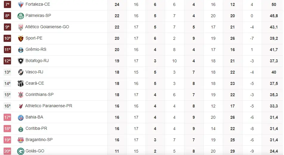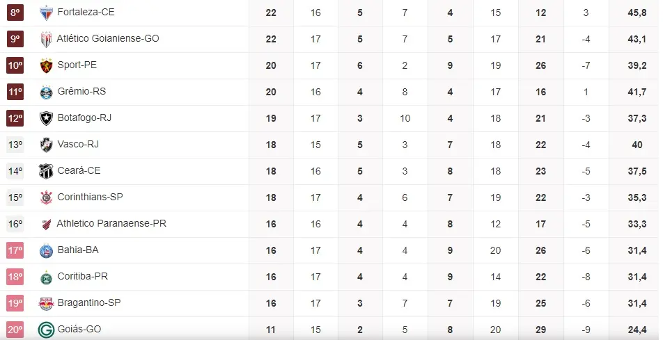 Ou seja, ir bem na 17ª rodada se tornou ainda mais importante, embora os adversários não sejam fáceis. O Ceará visita o Fluminense no sábado no Maracanã, em um jogo em que o time cearense está empolgado ao bater o Corinthians no Castelão de virada e quer tirar pontos do Flu, 5º colocado com 25 e em grande fase.