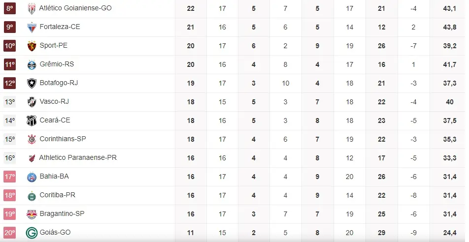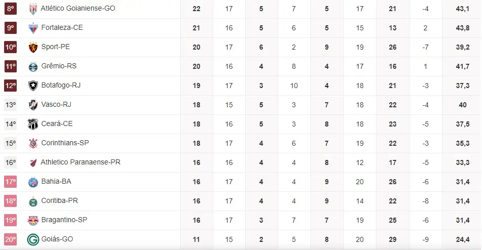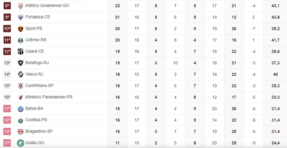 Lembrando que pelo atual momento da Série A, o colunista aponta 10 adversários diretos de Vovô e Leão na luta pela permanência: Atlético-GO (21 pontos), Sport (20 pontos), Vasco (18 pontos), Corinthians (18 pontos), Botafogo (18 pontos), Bahia (16 pontos), Coritiba (16 pontos), Athletico/PR (15 pontos), Bragantino (13 pontos) e Goiás (10 pontos).