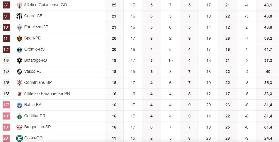 E sem entrar em campo, Fortaleza e Ceará viram seus adversários diretos na luta pela permanência conseguirem bons resultados. O Coritiba venceu o Palmeiras por 3 a 1 fora de casa, o Atlético/GO venceu o Santos também fora, e o Corinthians bateu o Athletico/PR no Paraná. Com os resultados, o Tricolor se manteve em 8º com 21 pontos e o Vovô perdeu duas posições, ficando em 13º com 18.