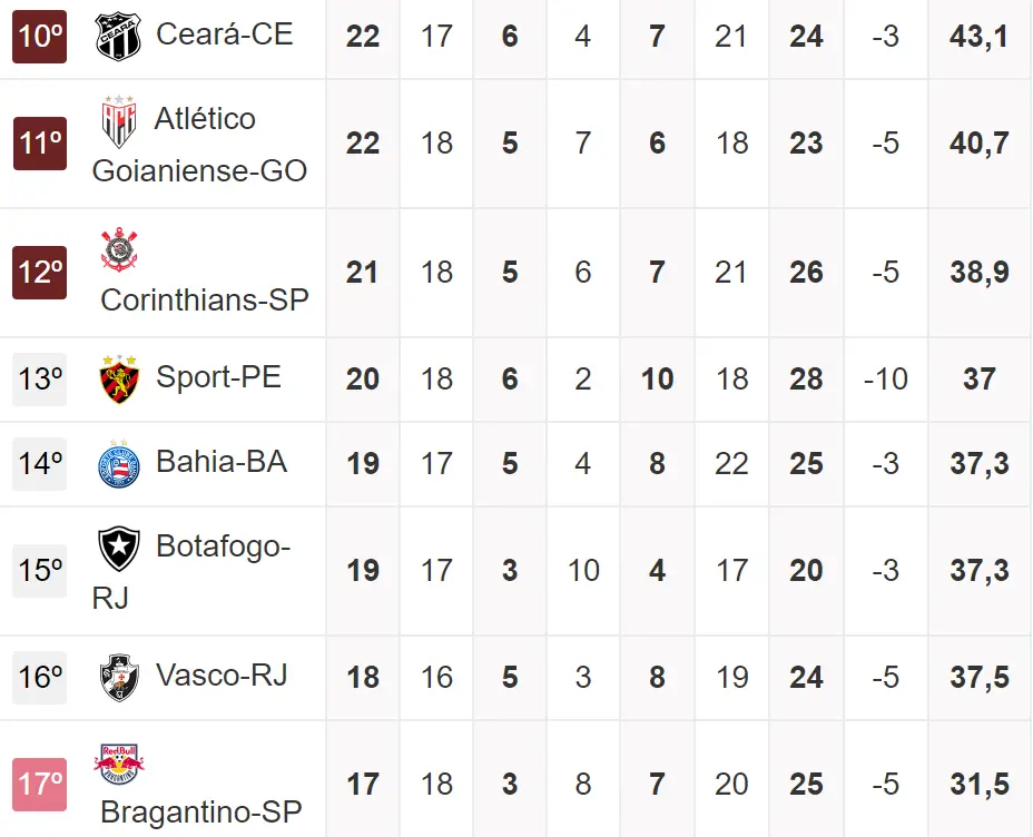 Assim, a projeção de resultados desta semana será apenas o Ceará. O time alvinegro está em 14º com 19 pontos em 16 jogos e uma vitória pode levar o Vovô ao G-10, abrindo uma pontuação importante para o Z4. Hoje o Vovô tem 2 pontos de vantagem para o Athletico-PR, a mesma para seu adversário na rodada, o Coritiba, mostrando um equilíbrio entre as forças da Série A, com uma pontuação melhor distribuída entre os participantes.