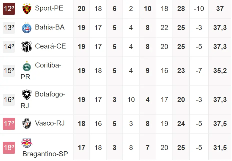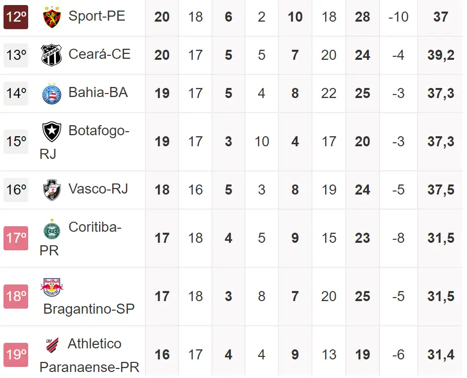 Lembrando que pelo atual momento da Série A, o colunista aponta 10 adversários diretos de Vovô e Leão na luta pela permanência: Atlético-GO (22 pontos), Corinthians (21 pontos), Sport (20 pontos), Bahia (19 pontos), Botafogo (19 pontos), Vasco (18 pontos), Athletico/PR (16 pontos), Coritiba (16 pontos), Bragantino (16 pontos) e Goiás (10 pontos).