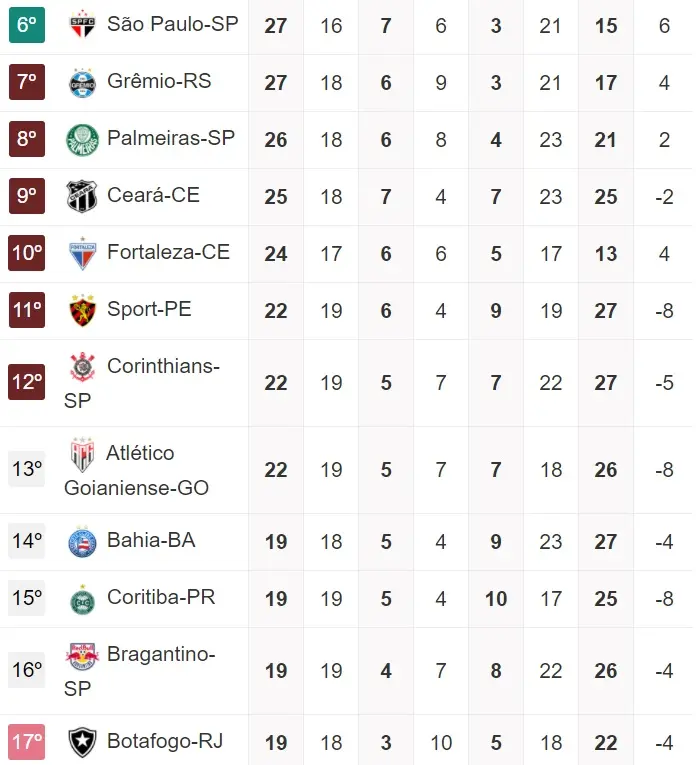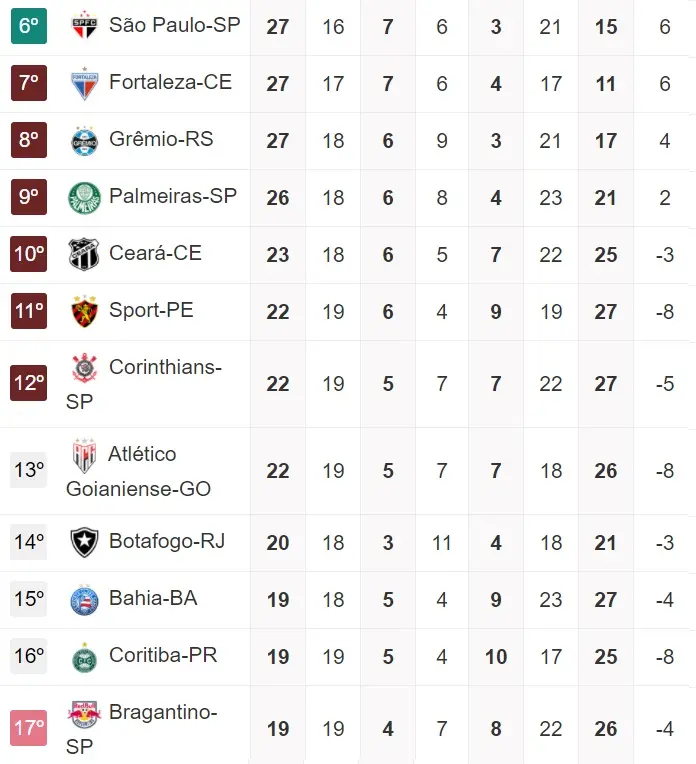 Com isso, o importante é Vovô e Leão continuarem focados em manter ou abrir distância para o Z4, pensando em outros objetivos após chegar aos 45 pontos. Apesar do Leão estar próximo do G6, apenas 3 pontos abaixo do 6º colocado, o São Paulo, e o Vovô três, as projeções precisam ser ainda pelo 1º objetivo que é a permanência.