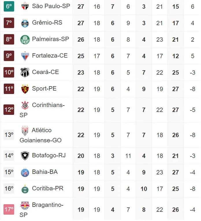 Lembrando que pelo atual momento da Série A, o colunista aponta 10 adversários diretos de Vovô e Leão na luta pela permanência: Atlético-GO (22 pontos), Sport (21 pontos), Corinthians (21 pontos), Bahia (19 pontos), Bragantino (19 pontos), Botafogo (19 pontos), Vasco (18 pontos), Athletico/PR (16 pontos), Coritiba (16 pontos) e Goiás (11 pontos).