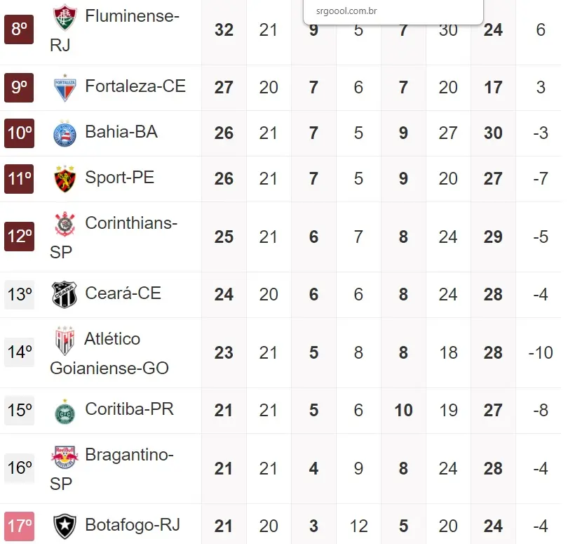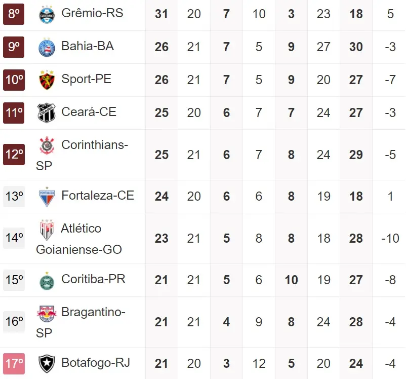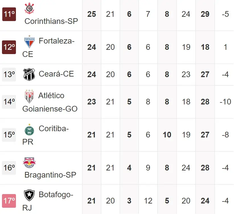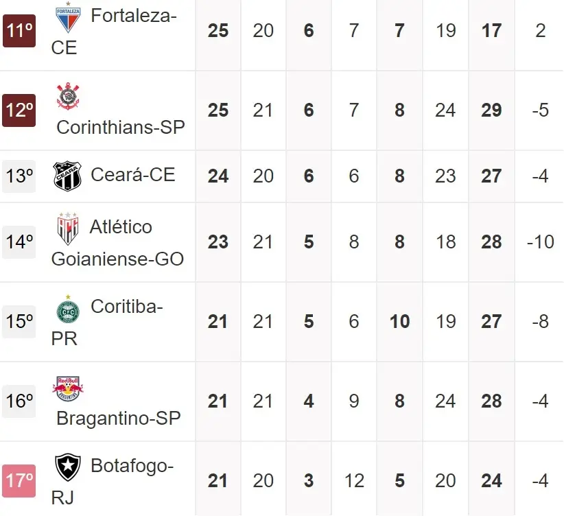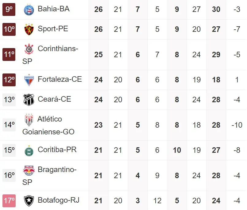 Lembrando que pelo atual momento da Série A, o colunista aponta 10 adversários diretos de Vovô e Leão na luta pela permanência:, Bahia (25 pontos), Sport (25 pontos), Corinthians (25 pontos), Atlético-GO (23 pontos), Coritiba (20 pontos), Bragantino (20 pontos), Botafogo (20 pontos), Vasco (19 pontos), Athletico/PR (19 pontos) e Goiás (12 pontos).