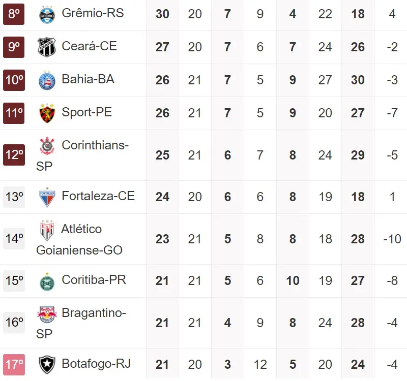Uma vitória do Ceará contra o Grêmio fora fará o time cearense saltar para a 9ª colocação, e se os resultados ajudarem, além de ultrapassar o rival Fortaleza, abre ótimos 6 pontos para o Z4