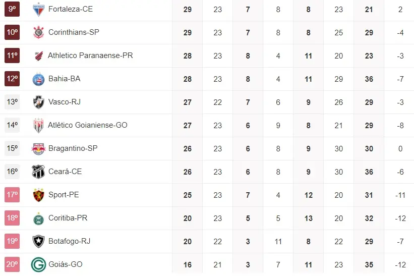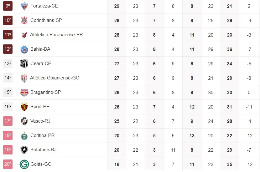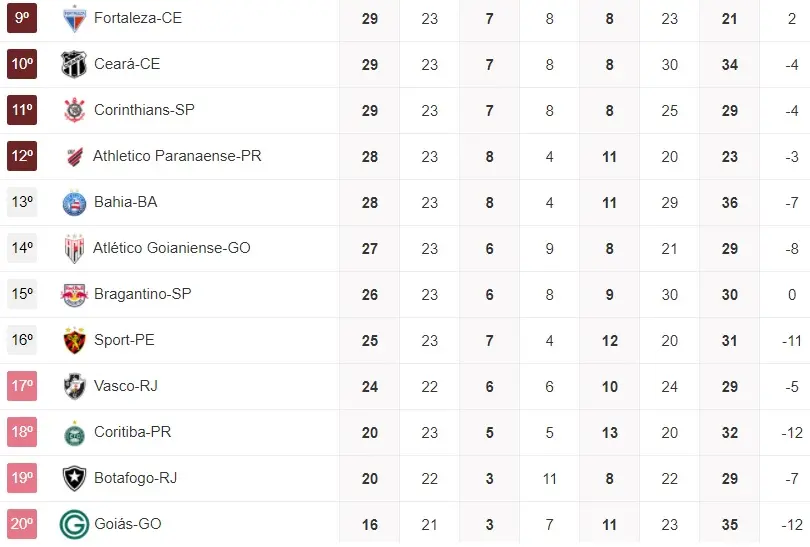 Lembrando que pelo atual momento da Série A, o colunista aponta 10 adversários diretos de Vovô e Leão na luta pela permanência: Corinthians (29 pontos), Athletico/PR (28 pontos), Bahia (28 pontos), Atlético-GO (27 pontos), Bragantino (26 pontos), Sport (25 pontos), Vasco (24 pontos), Coritiba (20 pontos) , Botafogo (20 pontos) e Goiás (16 pontos).