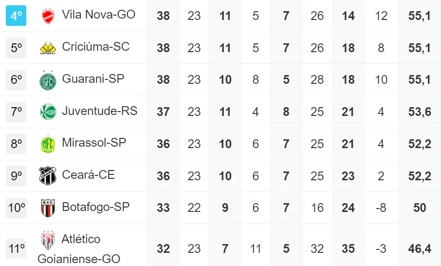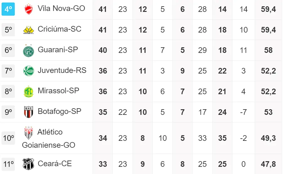 Pela pontuação, os adversários diretos do Ceará na luta pelo acesso são 7: Vila Nova (4º com 38), Criciúma (5º com 38), Guarani (6º com 37), Juventude (7º com 36), Mirassol (8º com 36), Botafogo/SP (10º com 32) e Atlético/GO (11º com 31).