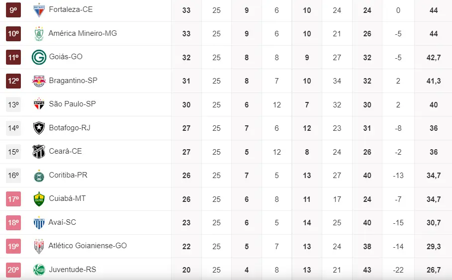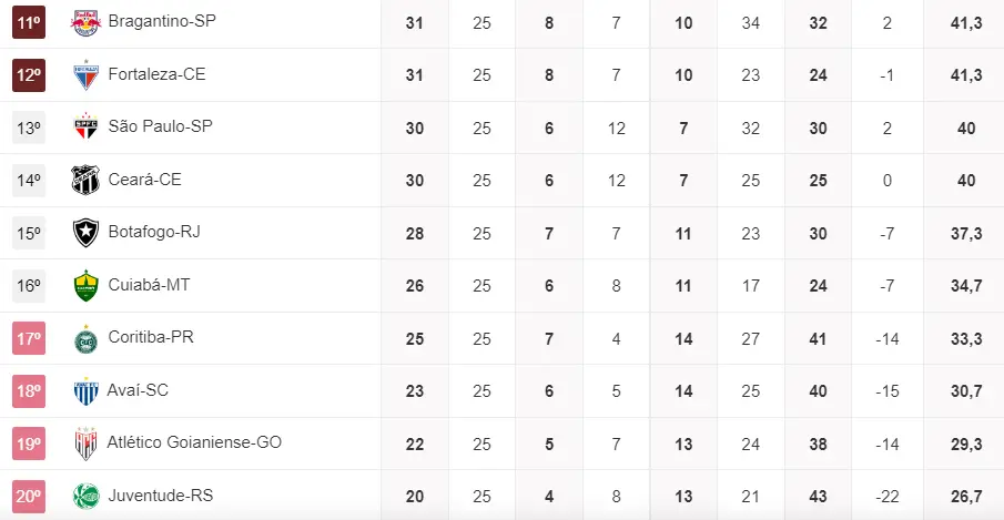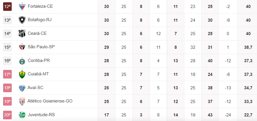 Veja que vitórias de Ceará, Avaí, Coritiba e Cuiabá fazem estes rivais se aproximarem do Leão em caso de derrota para o Bota no Castelão. A situação ainda não seria desconfortável, pela grande reação leonina, mas a diferença para o Z4 seria reduzida para apenas 2 pontos.