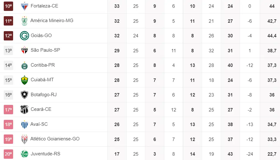 Com isso, o importante é Vovô e Leão continuarem focados em manter ou abrir distância para o Z4, pensando em outros objetivos após chegar aos 45 pontos. Almejar uma vaga na Copa Sul-Americana ou até Libertadores, só após alcançar a pontuação de segurança.