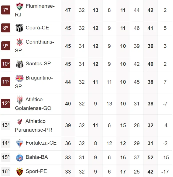 O Santos tem 45 pontos e pode ser um rival direto do Ceará caso perca a final da Libertadores para o Palmeiras. Aqui é muito difícil que o Goiás vença, mas um tropeço seria ótimo para o Vovô.