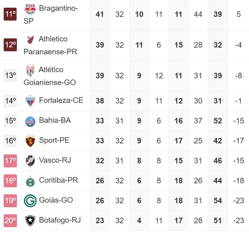 Lembrando que pelo atual momento da Série A, o colunista aponta 9 adversários diretos para o Leão na luta pela permanência: Bragantino (41 pontos), Athletico-PR (39 pontos), Atlético-GO (39 pontos), Bahia (32 pontos), Sport (32 pontos), Vasco (32 pontos), Goiás (26 pontos), Coritiba (26 pontos) e Botafogo (23 pontos)