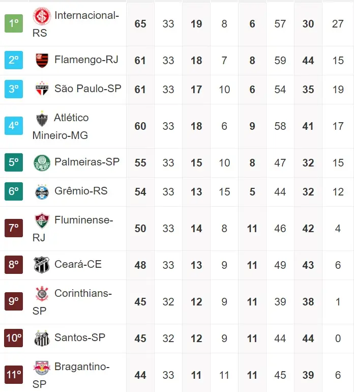 Os rivais diretos do Vovô por vaga na Libertadores são 6: Fluminense (50 pontos), Corinthians (45 pontos), Santos (45 pontos), Bragantino (44 pontos), Atlético/GO (42 pontos) e Athletico/PR (42 pontos).
