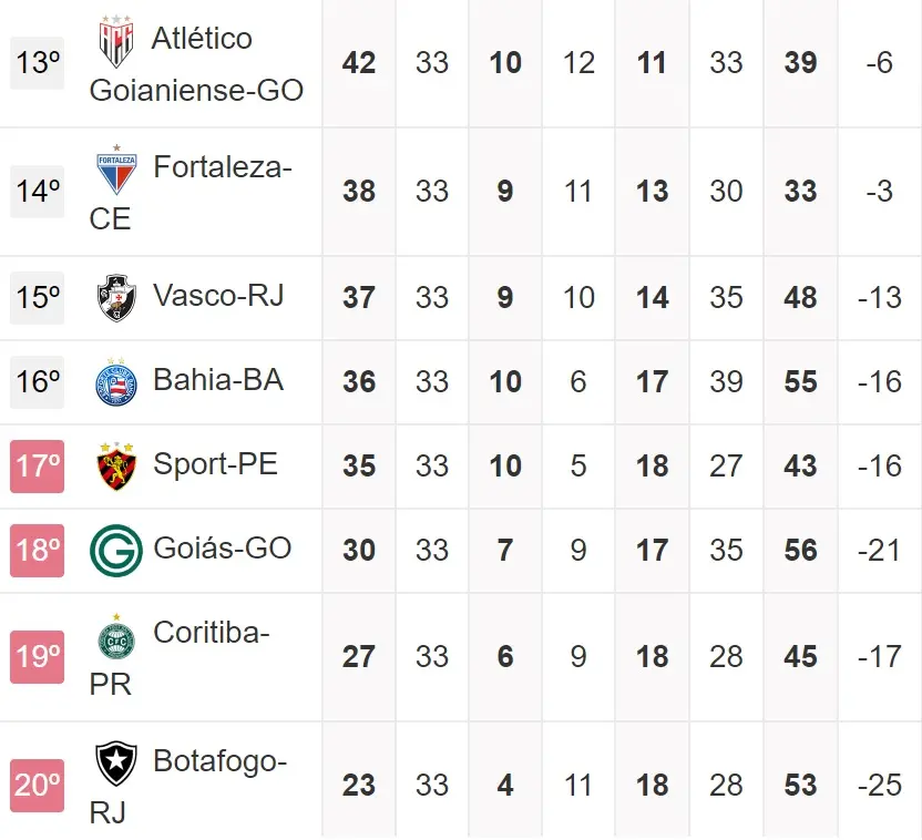 Já o Tricolor de Aço, está no Z-4 após a vitória do Bahia em jogo atrasado no meio de semana, ocupando a 17ª colocação com 35 pontos, precisando reagir urgentemente.