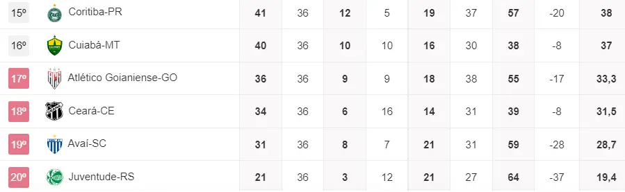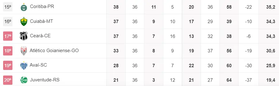 Já os adversários diretos do Ceará pela permanência são 4: Coritiba (15º com 38), Cuiabá (16º com 37), Atlético-GO (18º com 33) , Avaí (19º com 28). O Juventude já está matematicamente rebaixado com 21 pontos.