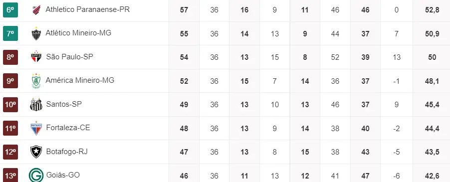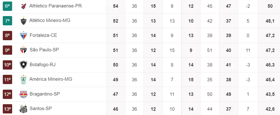 Pela pontuação, os adversários diretos do Fortaleza na luta por uma vaga na Libertadores são 5: Atlético/MG (7º com 52), São Paulo (8º com 51), Botafogo (10º com 47), América-MG (9º com 49), Santos (12º com 46).