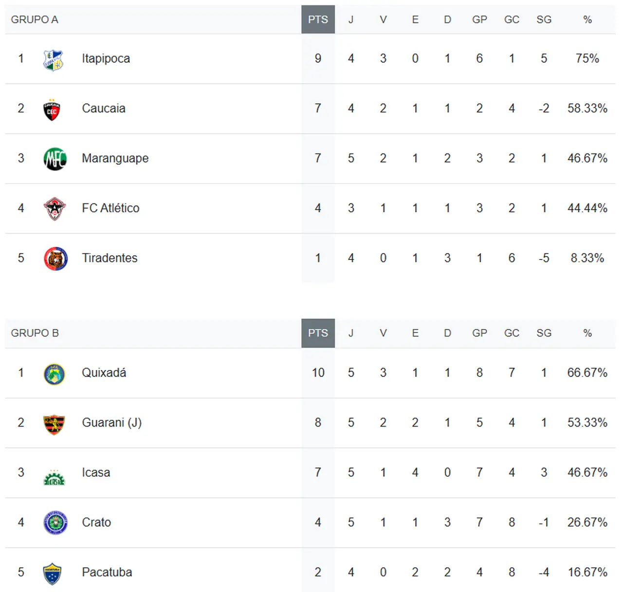 Já contra o rebaixamento, que serão os dois piores da classificação geral, precisam redobrar a atenção o Tiradentes (1 ponto), Pacatuba (2 pontos) e Crato (4 pontos). O Atlético tem apenas 4 pontos, mas apenas 3 jogos, tendo potencial para reagir.