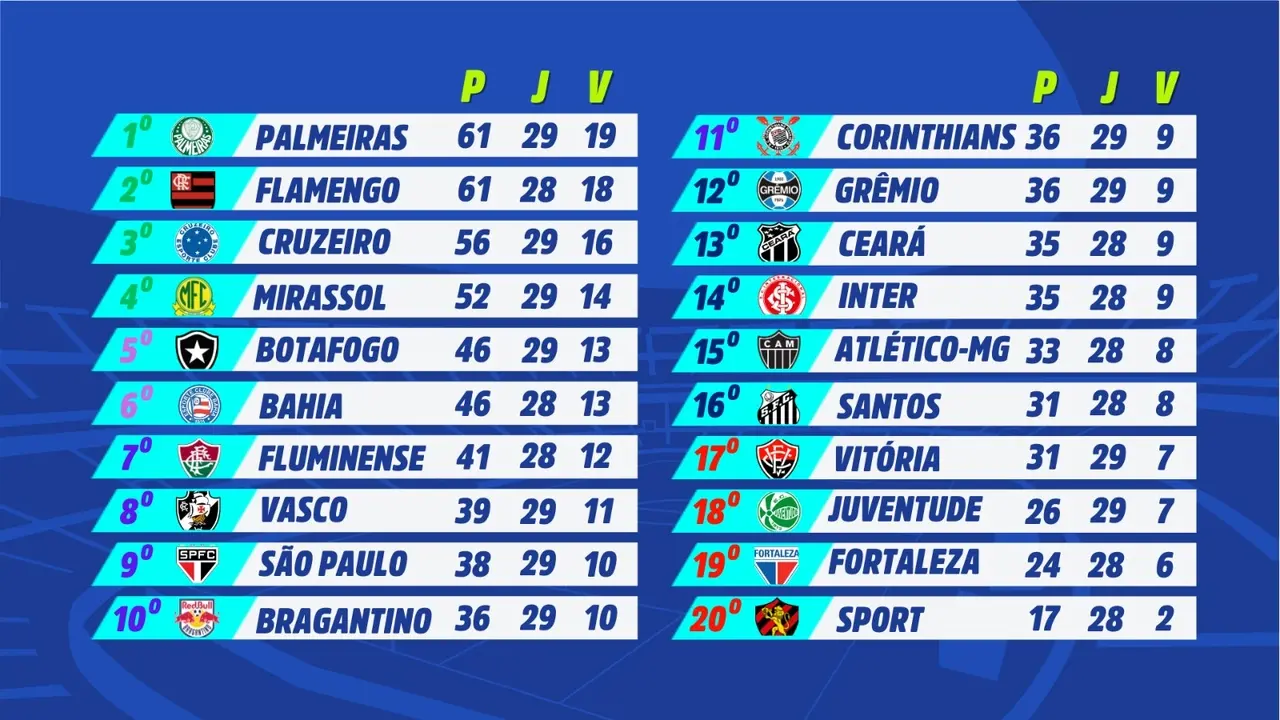 O encerramento da 29ª rodada da Série A redefiniu a disputa contra o rebaixamento. O crescimento do Vitória, 17º colocado, chegando aos 31 pontos em 29 jogos, colocou um 'bolo' de clubes sob risco: do Bragantino, 10º colocado, com 36 pontos, para baixo - o Ceará está em 13º com 35 - até o Fortaleza, 19º com 24 pontos, estão nessa luta. Só o Sport, 20º com 17 pontos já virtualmente rebaixado, estando 14 de sair do Z4.