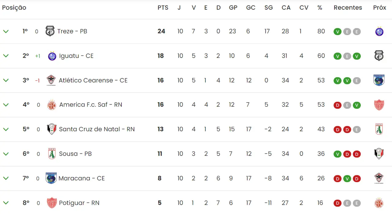 Quanto a classificação dos cearenses, Iguatu e Atlético uma 'gordura' dentro do G4 para o Santa Cruz/RN, adversário mais próximo e principal 'ameaçada' pela vaga. Como o Sousa está um pouco atrás, com 11 pontos, a chance dos dois cearenses avançarem juntos é muito grande.