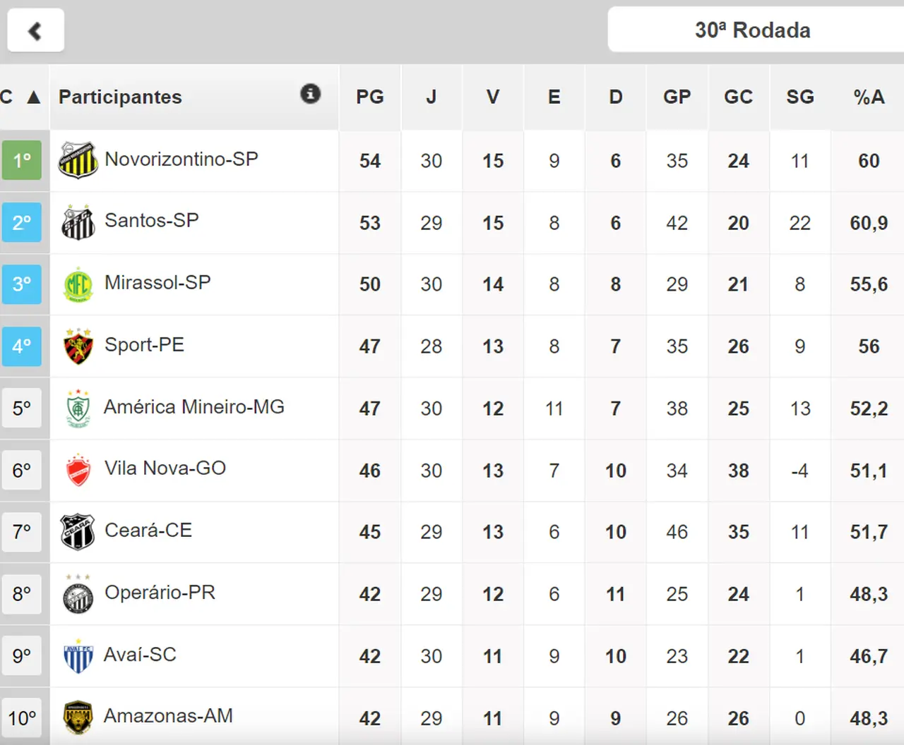 Hoje o Vovô é o 7º colocado após os resultados paralelos da 30ª rodada. O time perdeu uma posição e viu dois adversários diretos vencerem nos acréscimos: América/MG e Mirassol.