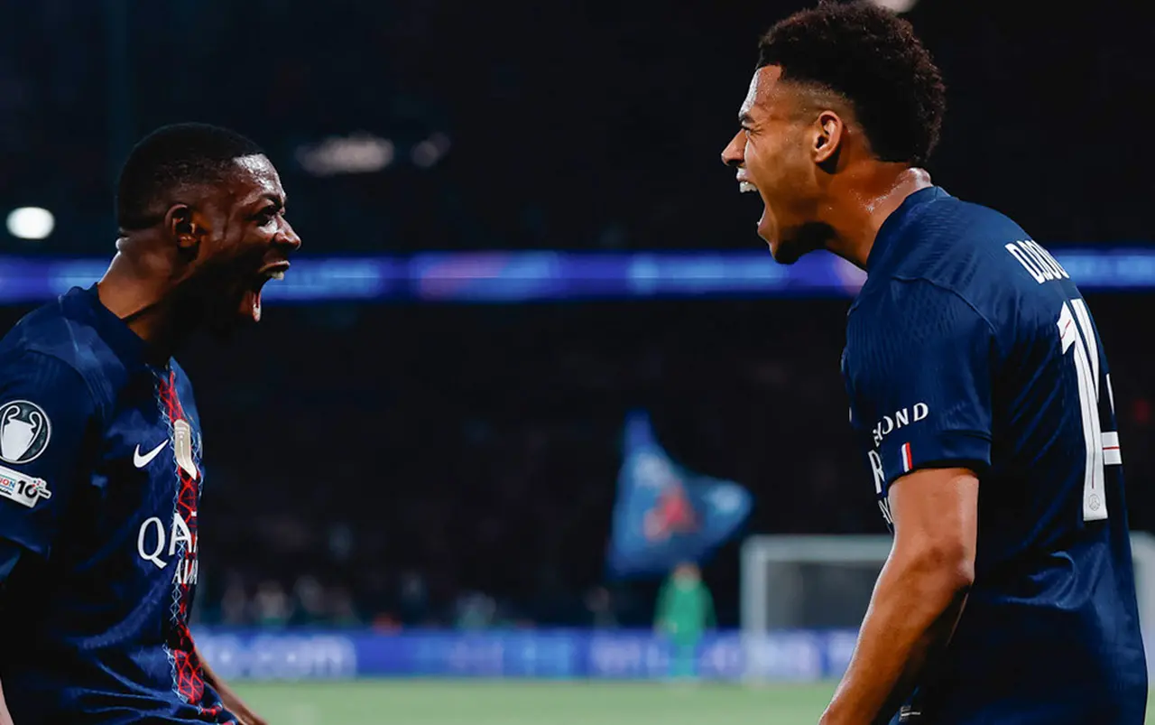 Dembele e Doue comemoram gol do PSG contra o Liverpool
