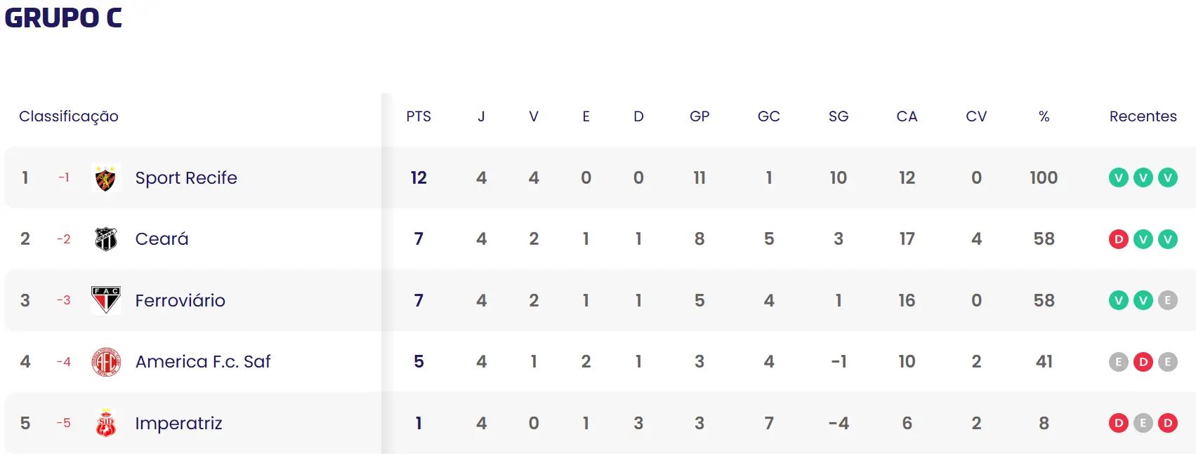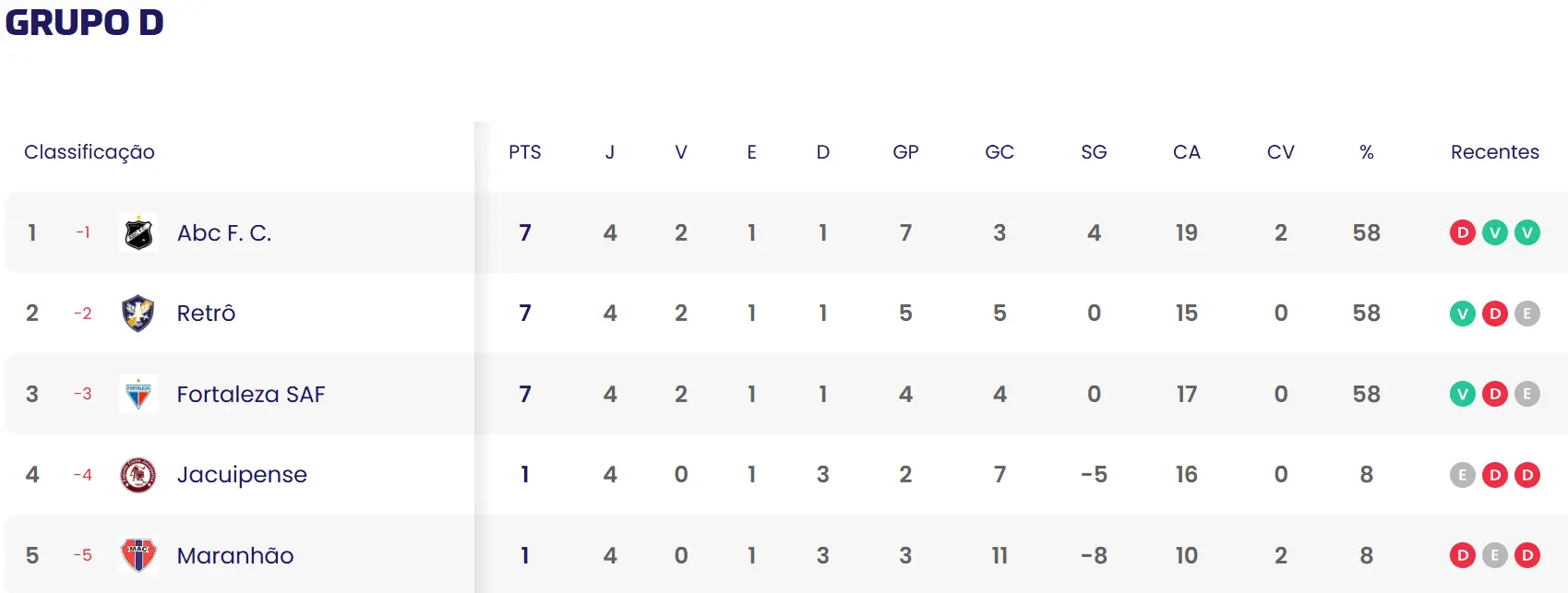 Ceará e Ferroviário estão no Grupo C e travam luta direta, com o América/RN correndo por fora. Já o Fortaleza está no Grupo D e disputa com ABC e Retrô.