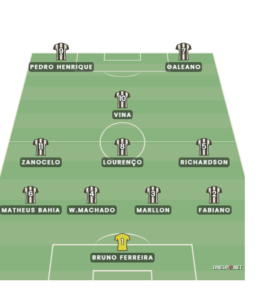Seria uma formação diferente, no 4-3-1-2, sem centroavante, já que Pedro Raul está sendo contestado pela torcida. Seriam 3 volantes (Zanocelo, Lourenço e Richardson), com com Vina centralizado, e Fernandinho e Pedro Henrique na frente.