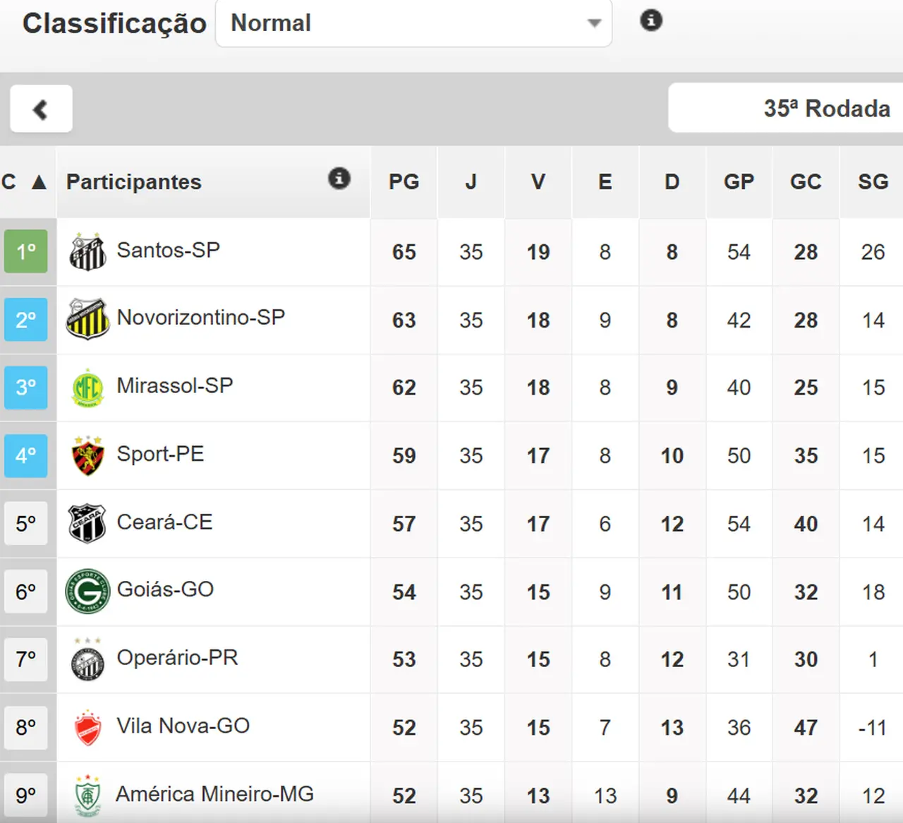 E pela classificação, 3 clubes já acima dos 62 pontos - Santos (65), Novorizontino (63) e Mirassol (62) - está se desenhando apenas uma vaga aberta, do 4º colocado, que deve ficar entre Ceará e Sport.