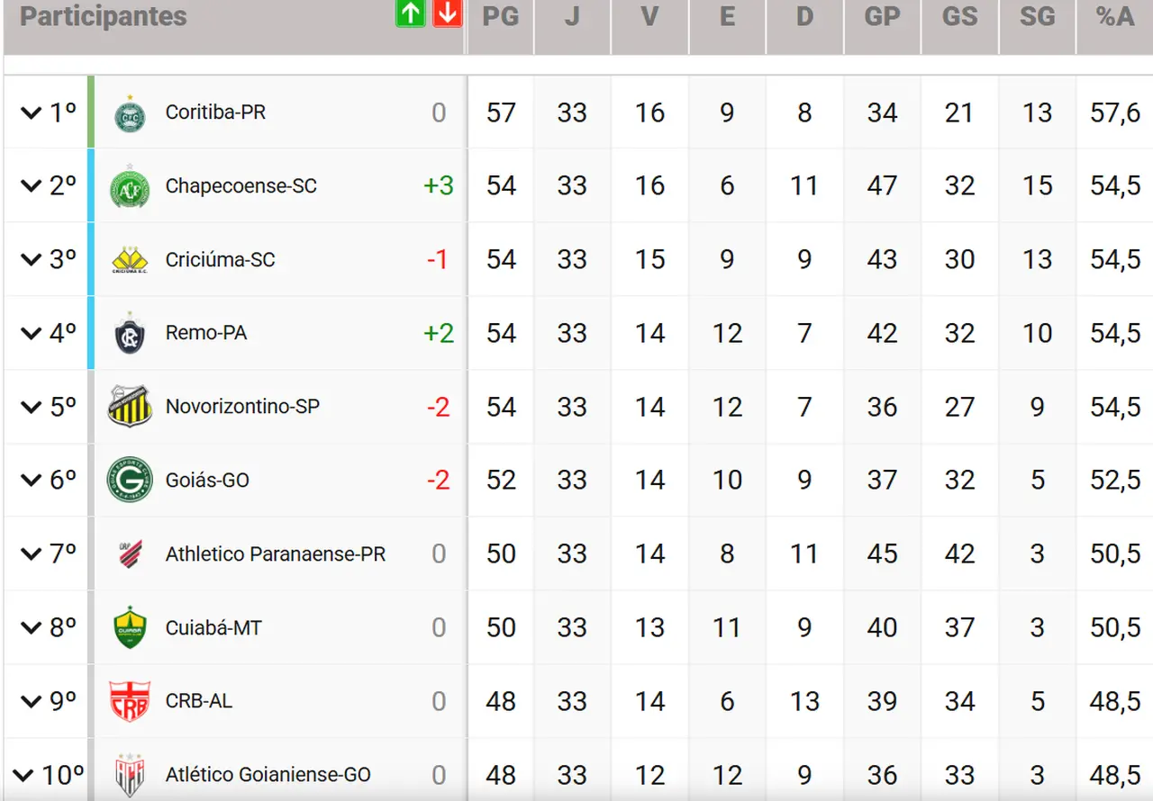 O Coxa, líder, tem vantagem de apenas 3 pontos para o 5º colocado, o Novorizontino, 1º time fora do G4. Enquanto o Dragão, está 6 pontos do G4.