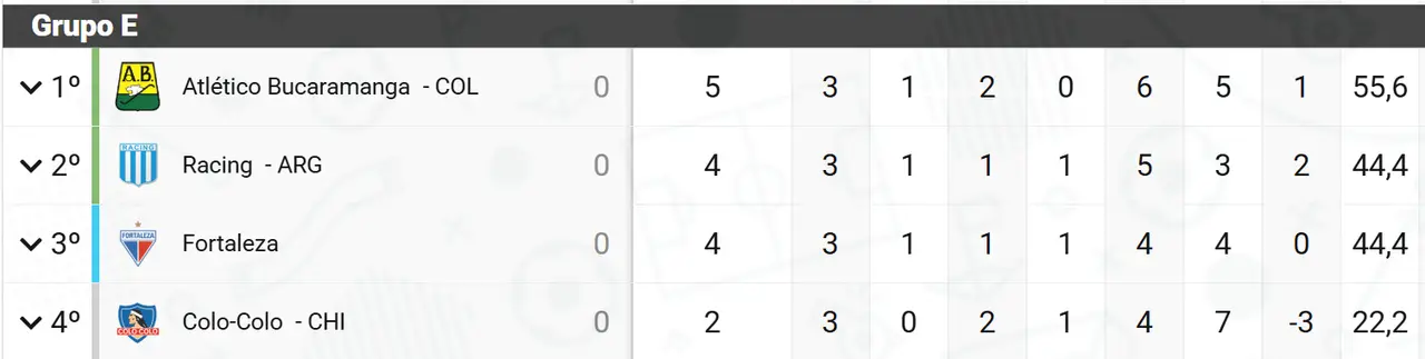 O Fortaleza entrou na briga pela vaga na 2ª Fase, ao sair da última colocação com 1 ponto e chegar aos 4. Na 3ª colocação, o Leão está atrás do Bucaramanga com 5 pontos, e empatado com o Racing, com 4. E na frente do Colo Colo que fica com 2.