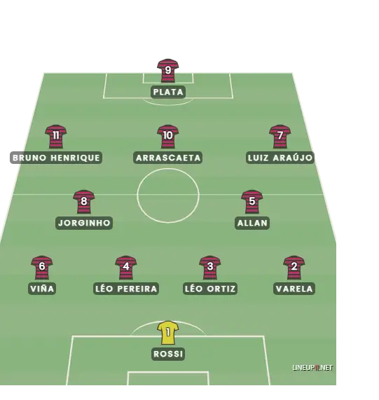 Assim, em momentos do jogo, é possível ver Arrascaeta na esquerda, Bruno Henrique centralizado no meio, ou Luis Araújo. Até se o centroavante for mais móvel, como Plata ou Juninho - Wallace Yan está suspenso e não enfrenta o Ceará - este também pode cair para uma ponta e outro jogador estar ali.