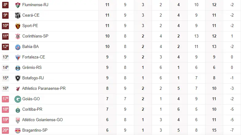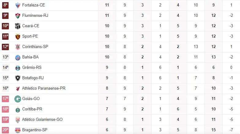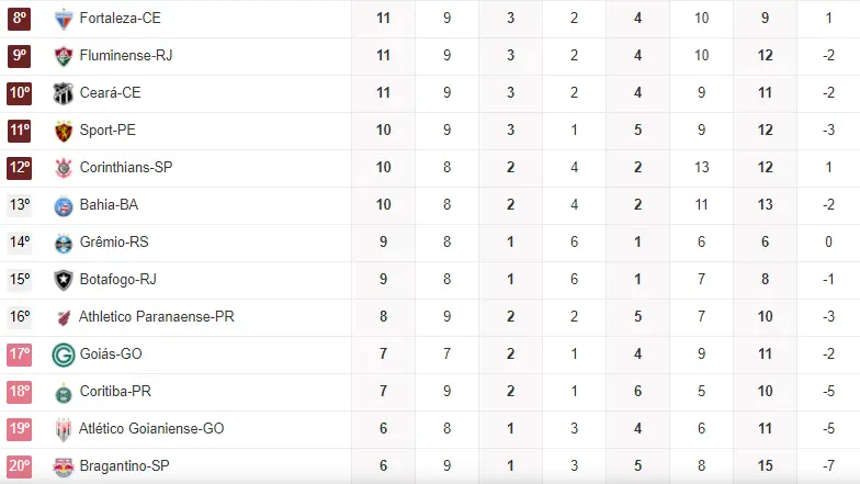 Outro confronto direto na parte debaixo da tabela, entre o último colocado e quem abre o Z4. Como o Goiás é o último com apenas 4, ele vencer e segurar o Coritiba, que tem 7, não é de todo ruim