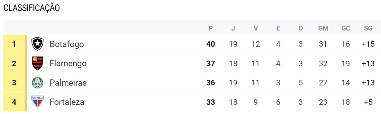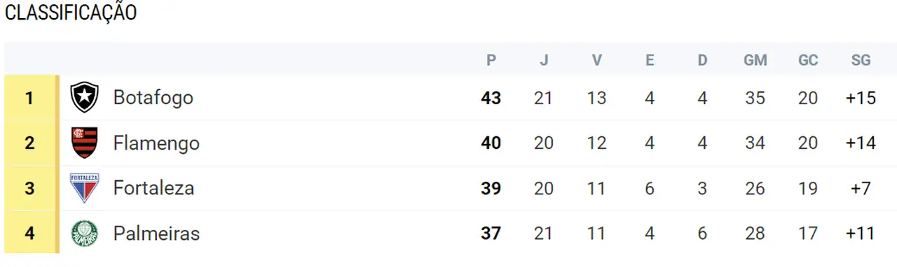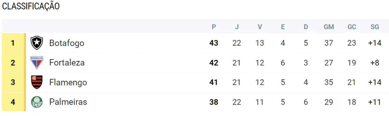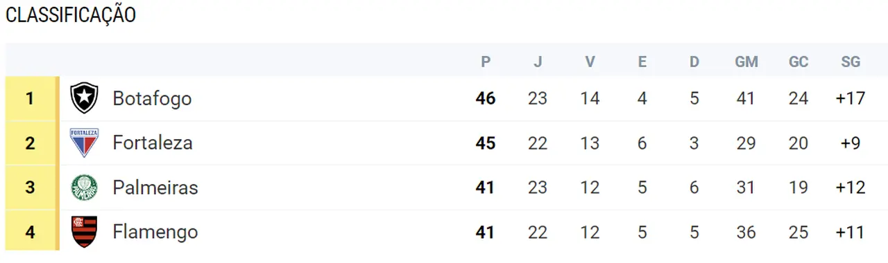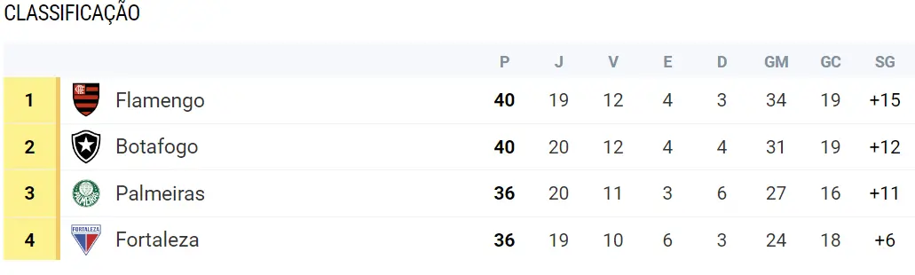 O Bota terminou o turno com 40 pontos, na liderança, contra 33 do Fortaleza, que terminou em 4º. Ou seja, o time carioca tinha 7 pontos na frente do Leão.