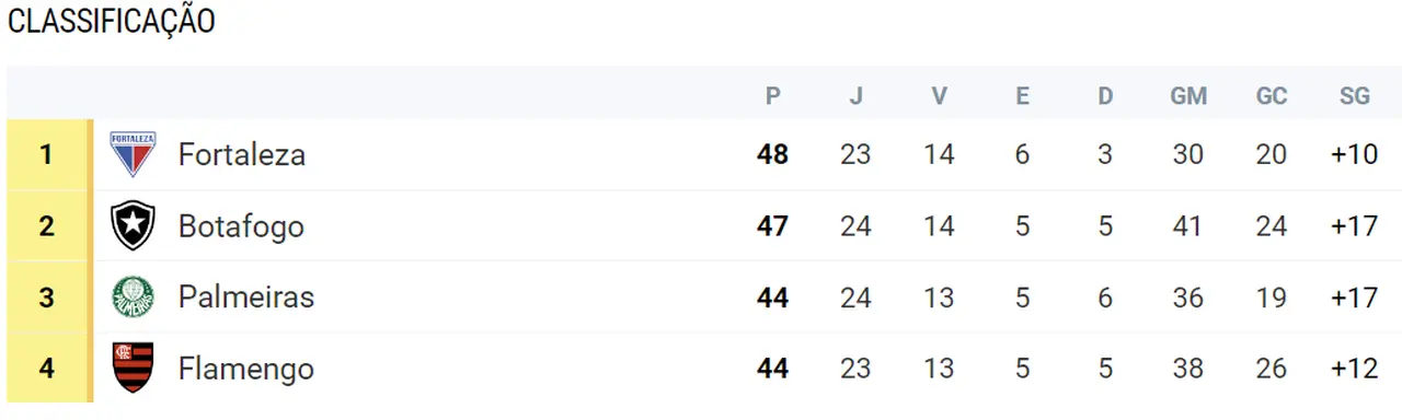 O Fortaleza assumiu a liderança da Série A do Campeonato Brasileiro no último domingo (25), ao vencer o Corinthians no Castelão e contar com o empate do Botafogo diante do Bahia em Salvador. O Leão chegou aos 48 pontos, deixando o Botafogo com 47. As duas equipes se enfrentam em confronto direto no sábado (31), no Nilton Santos, pela 25ª rodada.