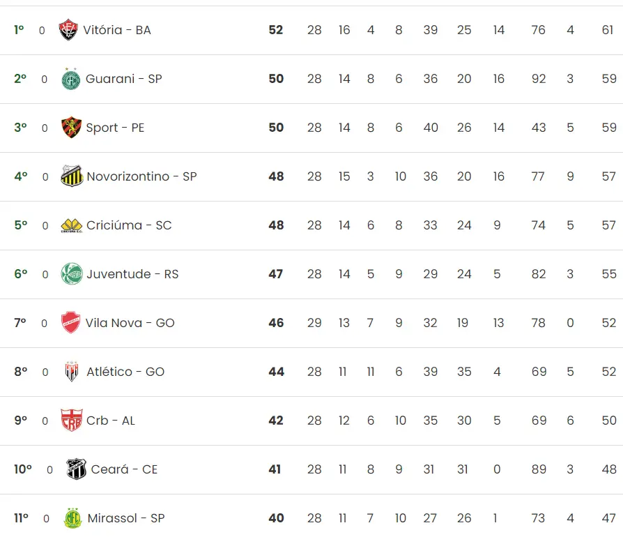 A classificação da Série B está assim, com Vitória, Guarani, Sport e Novorizontino integrando o G4, mas Criciúma, Juventude e Vila Nova/GO estão próximos.