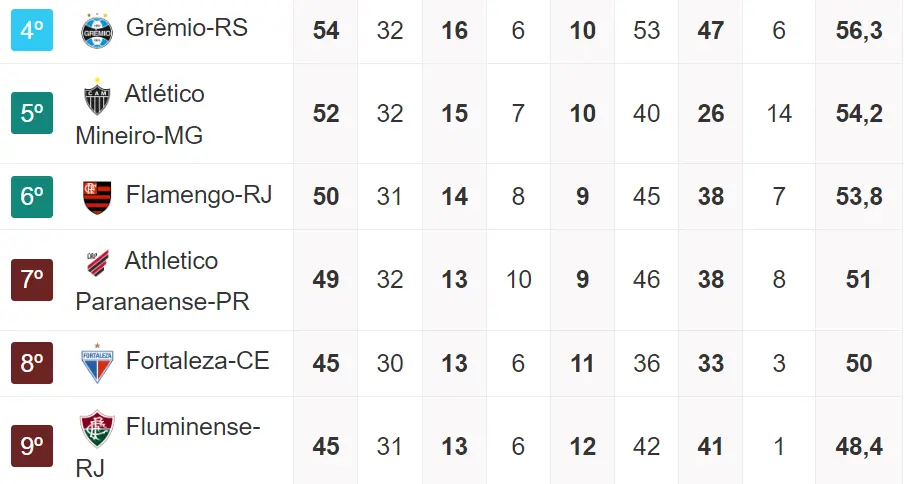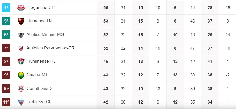 Pela pontuação, os adversários diretos do Leão do Pici na luta por uma vaga na Libertadores são 7: Grêmio (4º com 53 pontos), Atlético (5º com 52), Flamengo (6º com 50), Athletico-PR (7º com 49), Fluminense (8º com 45) e Cuiabá (11º com 40) e Corinthians (12º com 40).