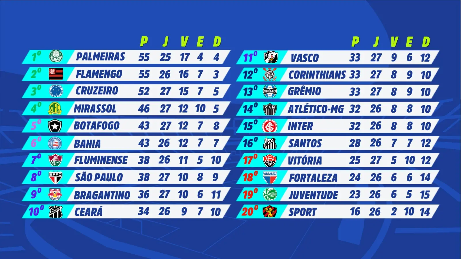 O detalhe é que do Galo até o Sport, todos os times possuem 26 jogos. Apenas o Vitória, 17º com 25, já tem 27 partidas. Claro que Vasco, Corinthians e Grêmio, a 'turma' dos 33 pontos, ou mesmo Galo e Inter, com 32, podem cair de rendimento e entrem nessa inglória disputa.