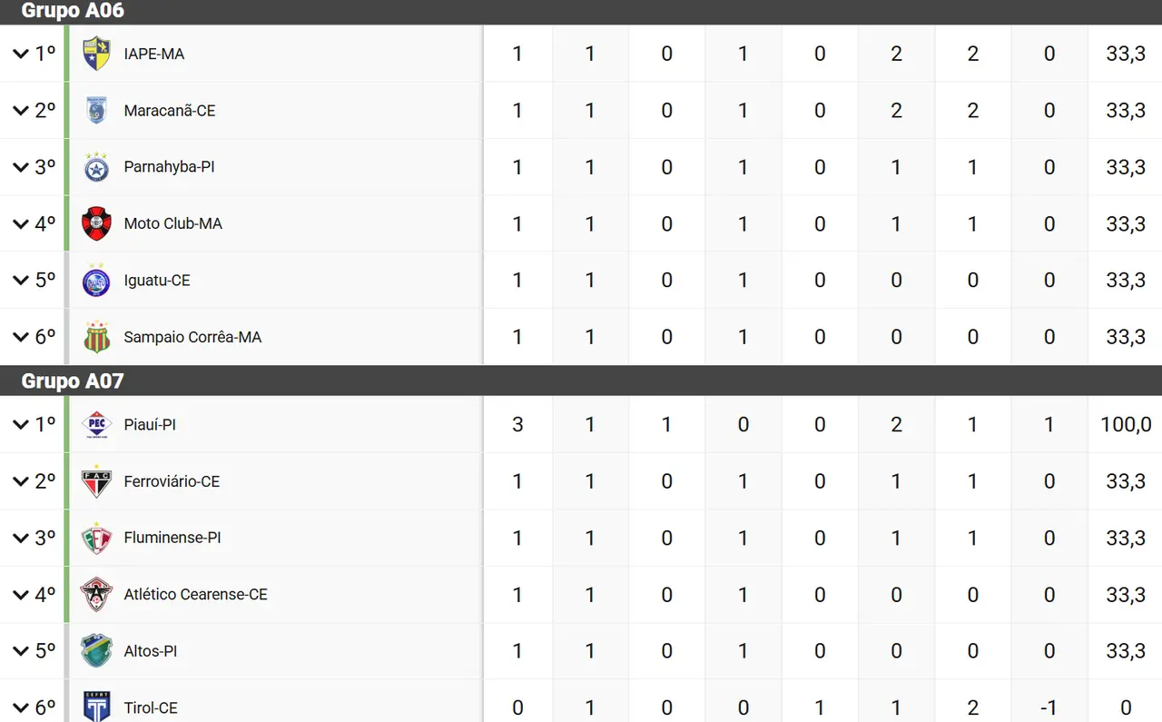 Classificação dos Grupos dos Cearenses após jogos a 1ª rodada: