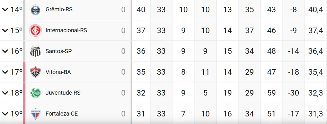 Restando 5 rodadas para o fim da Série A, 6 clubes correm risco de rebaixamento. O critério para definir os times é a diferença de pontos para o Vitória, time que abre o Z4. Do Grêmio, 14º com 40, ao Juventude, 19º com 32, todos estão na luta. O Sport já caiu.