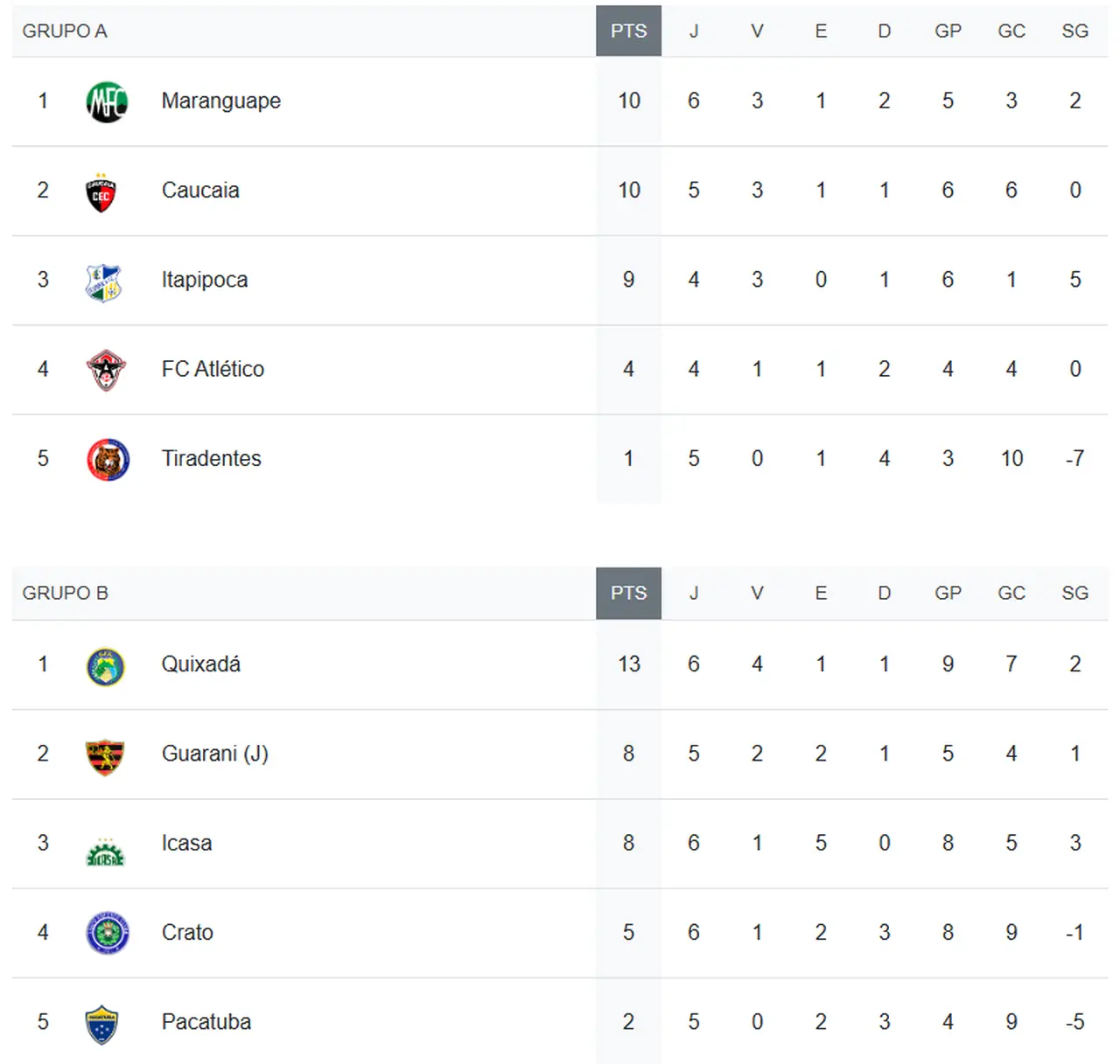 O detalhe é que o Itapipoca tem 2 jogos a menos que o Maranguape e um que o Caucaia. Os jogos atrasados serão nos dias 13 e 17, e podem mudar a configuração da liderança do Grupo A.