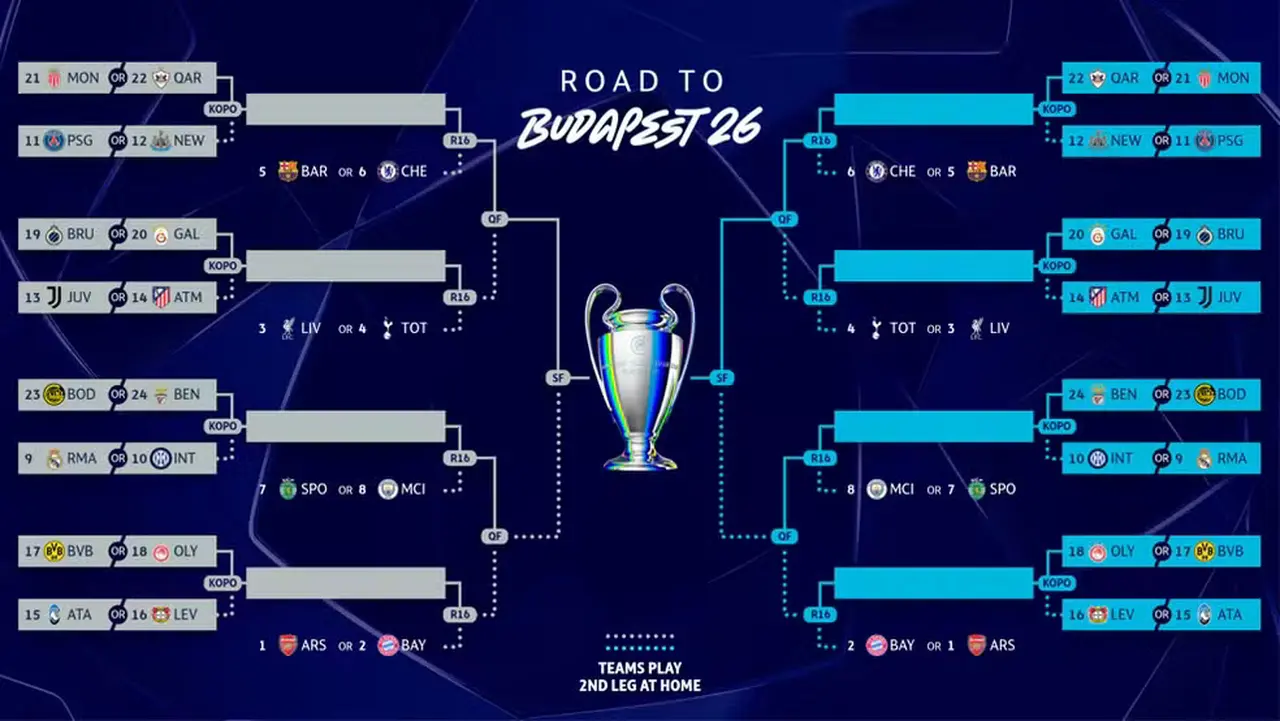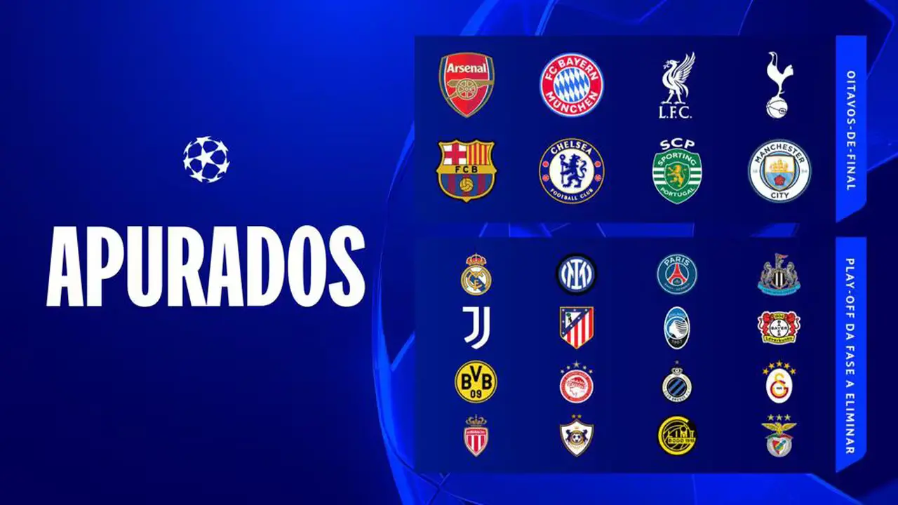 Real Madrid, Atalanta, Atletico de Madrid, Borussia Dortmund, Benfica, Bodo/Glimt, Club Brugge, Galatasaray, Inter, Juventus, Leverkusen, Monaco, Newcastle, Olympiacos, Paris, Qarabag jogarão os playoffs.