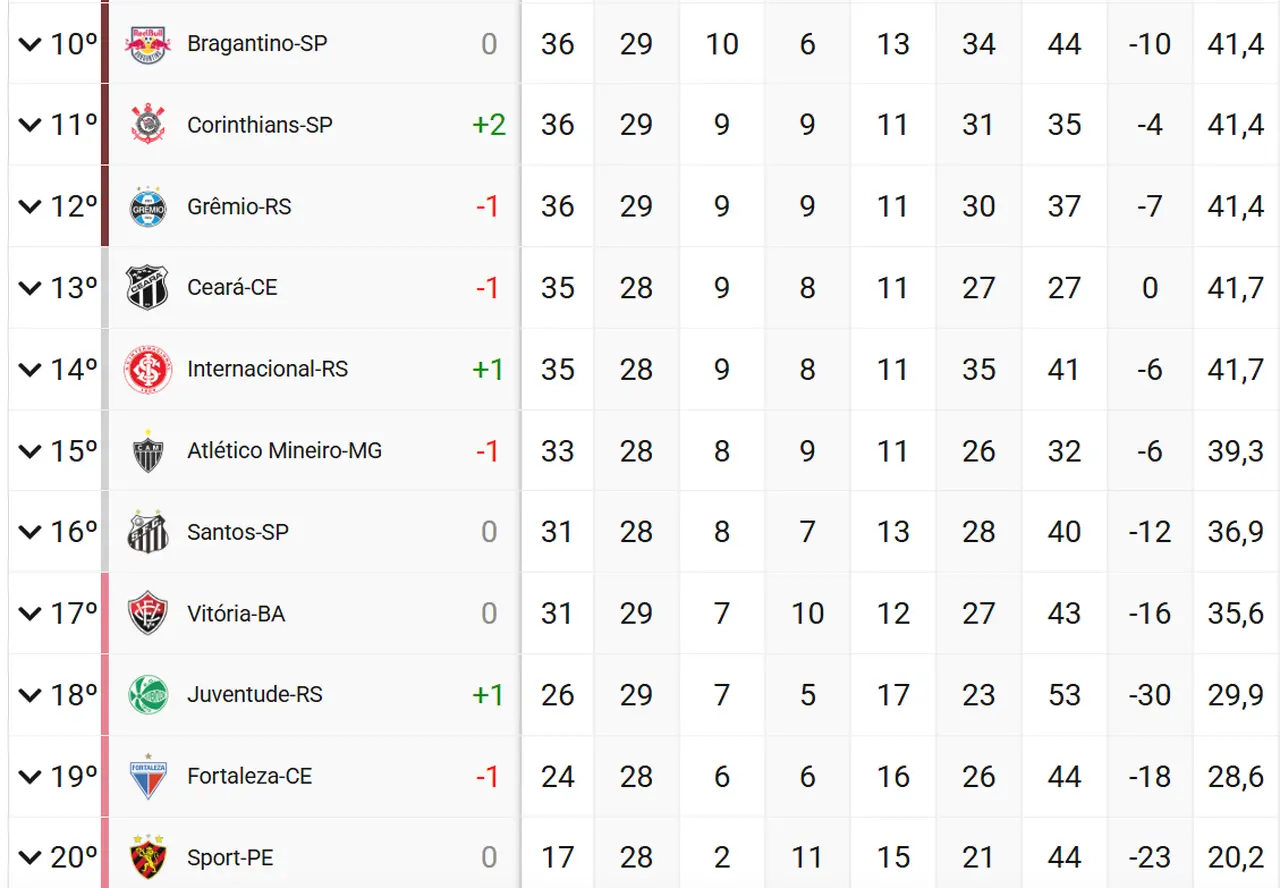 Analisando a classificação, do Bragantino, 10º colocado, com 36 pontos até o Fortaleza, 19º com 24, todos ainda lutam pela permanência. O Sport, com 17, está praticamente rebaixado, já que está 14 pontos de sair do Z4.