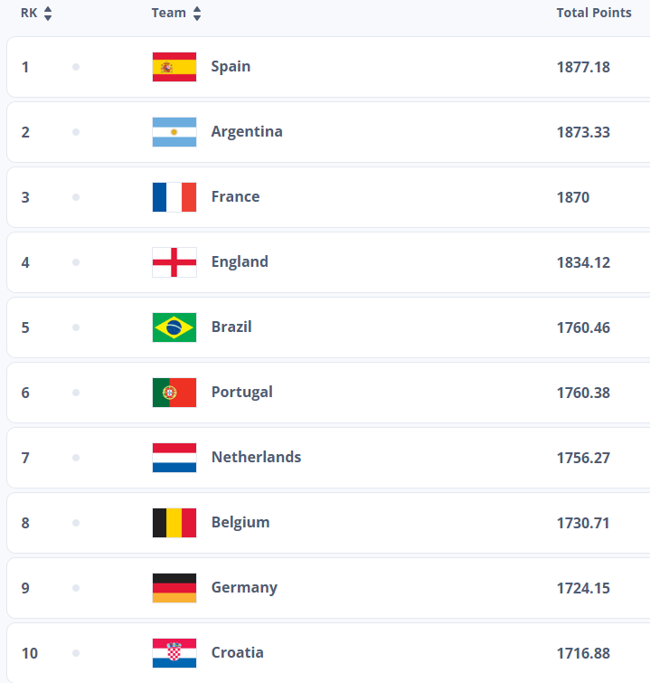 Para a atualização, foram considerados poucos jogos. Do Brasil, apenas o empate com a Tunísia em 1x1. Da líder Espanha, o empate com a Turquia em 2x2.
