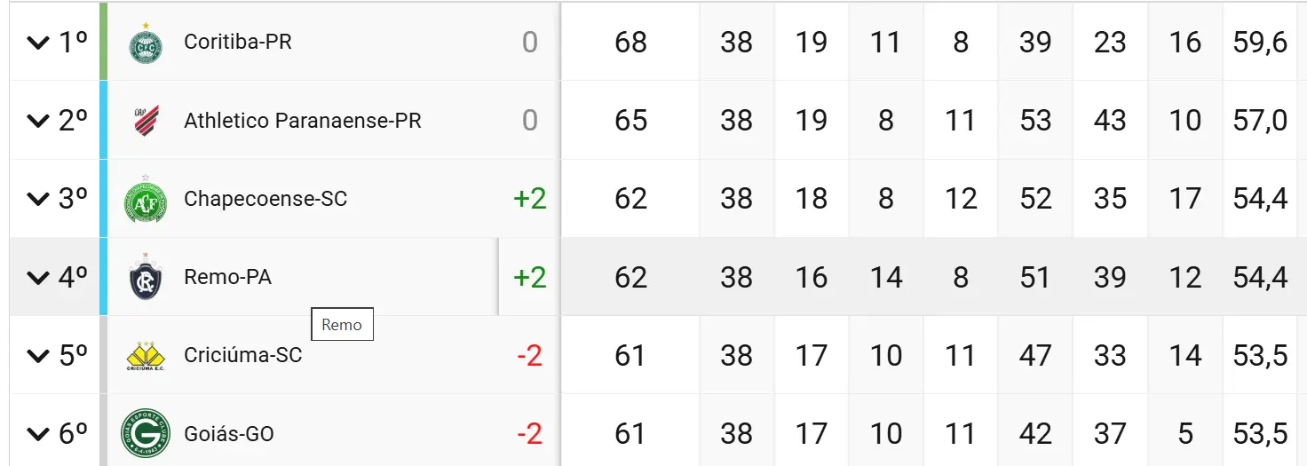 Quem ficou fora foi o Criciúma, 5º com 61, ao perder para o Cuiabá por 1x0 na Arena Pantanal. O Tigre só dependia de si, mas perdeu seu jogo.