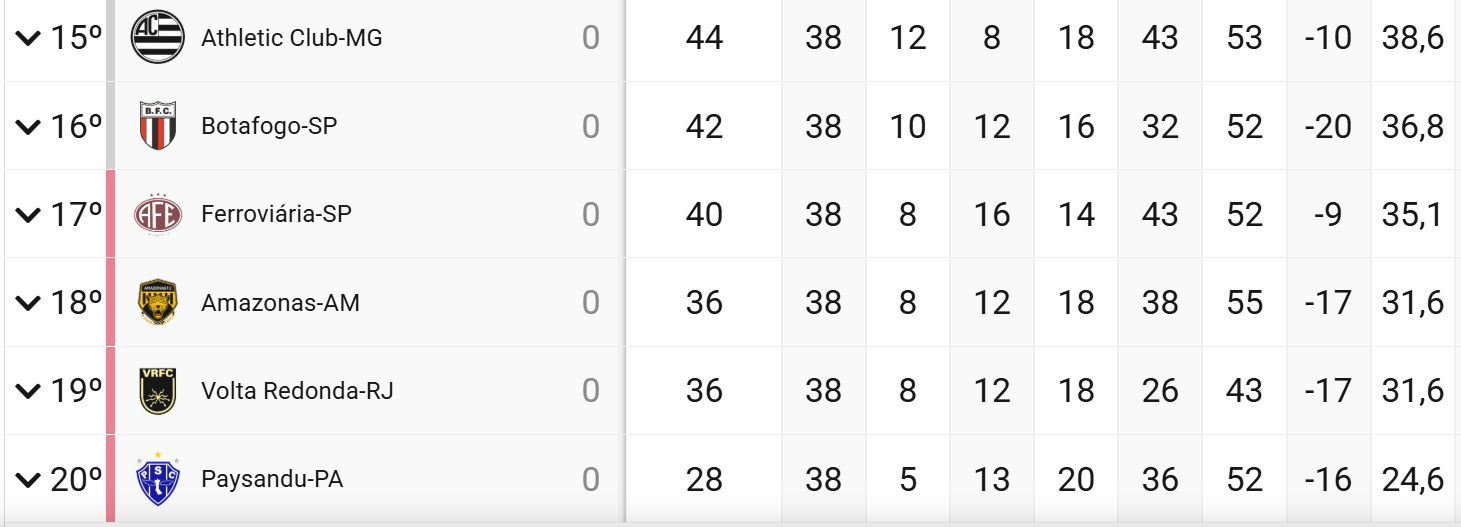 Uma vaga de rebaixamento foi definida nesta última rodada. E a Ferroviária caiu ao perder para o Operário/PR por 2x1 de virada. Assim, Botafogo-SP e Athletic-MG, que estava ameaçados, se salvaram.