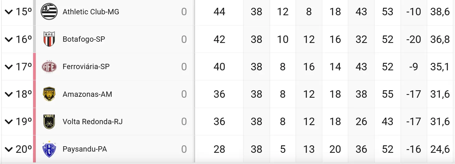 Além da Ferrinha, cairam, já com rodadas de antecedência: Amazonas, Volta Redonda e Paysandu.