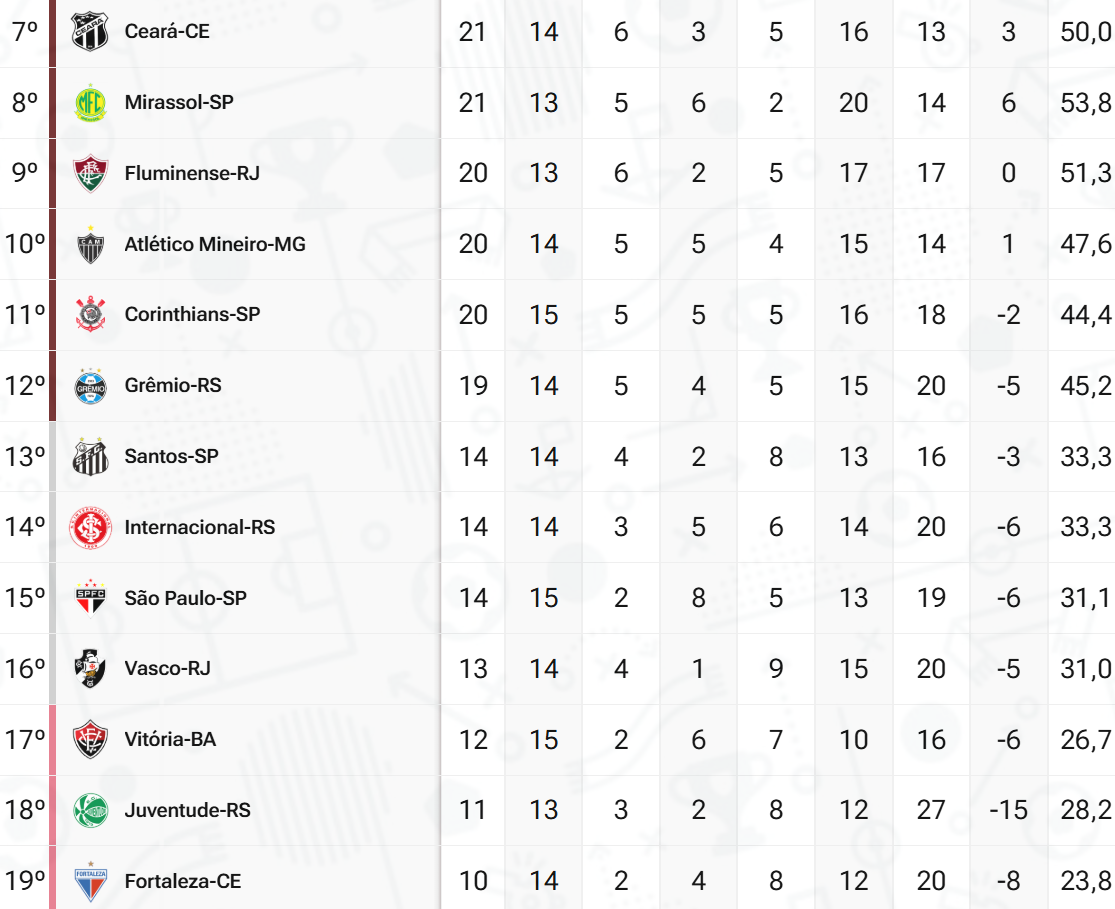 Uma derrota para o Fortaleza seria catastrófica, mantendo a equipe na 19ª colocação com 10 pontos. E ainda pode ver a distância para sair do Z4 aumentar para 6 pontos. Para isso, seriam necessários 'triunfos' de São Paulo, Vasco e Vitória.